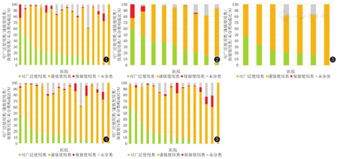 唑等;谨慎使用类,如哌拉西林他唑巴坦、第三代头孢菌素(头孢曲松、头孢噻肟)、碳青霉烯类(美罗培南、亚胺培南)、大环内酯类(阿奇霉素、红霉素)、糖肽类(万古霉素、替考拉宁)、喹诺酮类;保留使用类(如头孢吡肟、黏菌素、利奈唑胺等);未分类(不在基本药物目录中的抗菌药物)[1]。