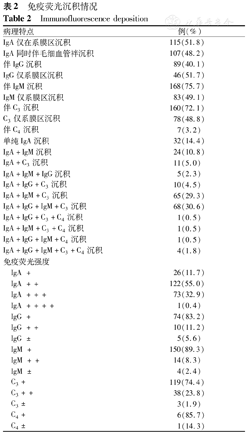 免疫荧光显示,IgA仅在系膜区沉积的患儿115例,其余患儿IgA同时伴毛细血管袢沉积。89例患儿伴IgG沉积,其中51.7%在系膜区沉积;168例伴IgM沉积,其中49.1%在系膜区沉积;160例伴C3沉积,其中48.8%在系膜区沉积;7例伴C4在系膜区沉积。单纯IgA沉积者32例,同时伴其他免疫球蛋白沉积以IgA+IgG+IgM+C3沉积最多,有68例;其次为IgA+IgM+C3者65例,4例表现为"满堂亮"。荧光强度分析显示,IgA ++最多;在所有伴IgG沉积患儿中,IgG +患儿最多;在所有伴IgM沉积患儿中,IgM +患儿最多;在所有伴C3沉积患儿中,C3+最多见,见表2。