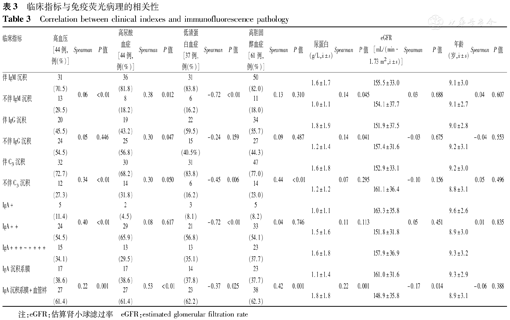 高血压与伴IgM、C3沉积、IgA沉积强度及IgA伴血管袢沉积均呈正相关(均P<0.05);高尿酸血症与伴IgM、IgG、C3沉积及IgA伴血管袢沉积均呈正相关(均P<0.05);低蛋白血症与伴IgM、C3沉积、IgA沉积强度及IgA伴血管袢沉积均呈负相关(均P<0.05);高胆固醇血症与伴C3沉积及IgA伴血管袢沉积均呈正相关(均P<0.05);尿蛋白定量与伴IgM、IgG及IgA伴血管袢沉积均呈正相关(均P<0.05); eGFR与IgA伴血管袢沉积呈负相关(P<0.05);年龄与免疫荧光病理无相关性,见表3。