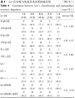 Lee氏分级与伴IgM及C3沉积、IgA沉积强度及IgA伴毛细血管袢沉积均呈正相关(均P<0.05);是否伴IgG与Lee氏分级无相关性,见表4。