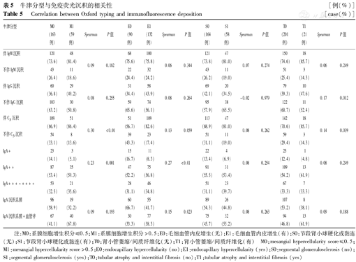 牛津分型M1与伴C3沉积、IgA沉积强度均呈正相关(均P<0.001); E1与IgA沉积强度及IgA伴毛细血管袢沉积均呈正相关(均P<0.05); S1与免疫荧光病理无相关性;T1与伴IgG及C3沉积均呈正相关(均P<0.05),见表5。
