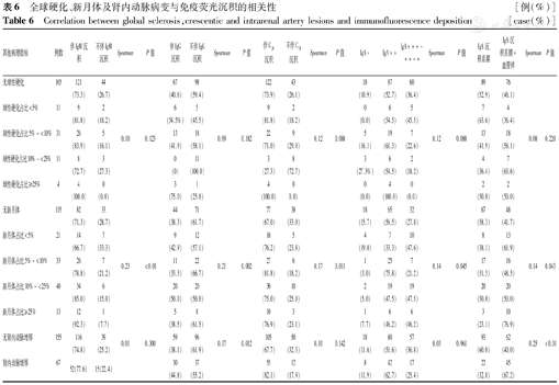 Correlation between global sclerosis,crescentic and intrarenal artery lesions and immunofluorescence deposition[case(%)]