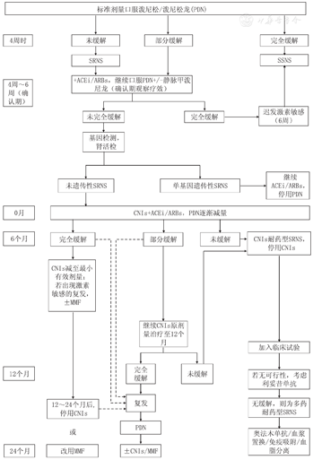 | 确认期 | 从开始PDN标准剂量治疗4~6周。在此期间,对于经4周PDN治疗获部分缓解者继续口服PDN和/或静脉甲泼尼龙冲击同时加用RAASi治疗,评估治疗反应。若6周时完全缓解则判定为迟发激素敏感,若未完全缓解则判定SRNS |