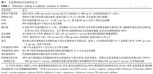 相关定义见表1(B,中度推荐),其中NS的诊断标准为肾病水平蛋白尿伴低白蛋白血症(血清白蛋白<30 g/L)或水肿(若无血清白蛋白数据)。
