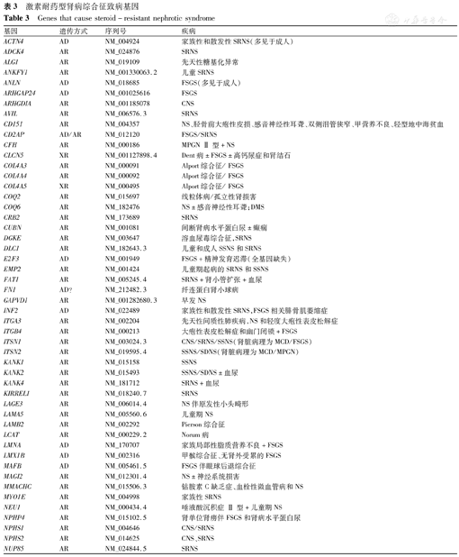 注:AD:常染色体显性遗传;SRNS:激素耐药型肾病综合征;AR:常染色体隐性遗传;FSGS:局灶节段性肾小球硬化;CNS:先天性肾病综合征;NS:肾病综合征;MPGN:膜增生性肾小球肾炎;XR:X连锁遗传;DMS:弥漫性系膜硬化;SSNS:激素敏感型肾病综合征;MCD:微小病变;SDNS:激素依赖型肾病综合征;MYH9:肌球蛋白重链9 AD:autosomal dominant;SRNS:steroid-resistant nephrotic syndrome;AR:autosomal recessive;FSGS:focal segmental glomerulosclerosis;CNS:congenital nephrotic syndrome;NS:nephrotic syndrome;MPGN:membranoproliferative glomerulonephritis;XR:X-linked recessive;DMS:diffuse mesangial sclerosis;SSNS:steroid-sensitive nephrotic syndrome;MCD:minimal change disease;SDNS:steroid-dependent nephrotic syndrome;MYH9:myosin heavy chain 9