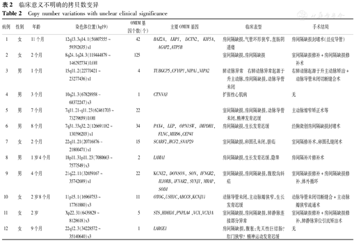 在芯片所识别的CNVs中,对≥105 bp的缺失或重复片段(可信度≥90%)进行分析。通过参考广州市妇女儿童医疗中心实验室内部数据库及公共数据库如DGV (Database of Genomic Variants,http://projects.tcag.ca /variation/)、DECIPHER(Database of Chromosomal Imbalance and Phenotype in Humans Using Ensembl Resources,http://decipher.sanger.ac.uk/)、OMIM(Online Mendelian Inheritance in Man,http://www.omim.org)、UCSC(http://genome.ucsc.edu /,hg19)、ISCA(the International Standards for Cytogenomic Arrays,https://www.iscaconsortium.org/)、ClinGen (Clinical Genome Resource,https://www.clinical genome.org/ )等,判断所检出的CNVs性质,根据国际指南将所检出CNVs分为致病性CNVs、临床意义不明确的CNVs(VOUS)及良性CNVs 3组[10],并进一步识别与CHD相关的致病基因。