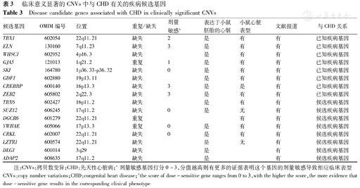 通过基因型与表型分析,在检出的致病性CNVs中发现TBX1、ELN、WHSC1、GJA5、SKI、GDF1、CREBBP、ZEB2等已报道的CHD致病基因,发现SUZ12、DGCR6、YWHAE、CRKL、LZTR1、DLG1、ADAP2、TBX6等基因是与CHD相关的候选致病基因(表3)。