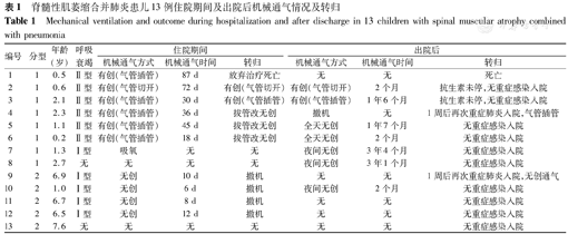 脊髓性肌萎缩合并肺炎患儿13例住院期间及出院后机械通气情况及转归