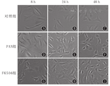 实验分为3组:对照组、PAN组和FK506组。对照组:培养液为RPMI 1640培养液;PAN组:培养液为含50 mg/L的PAN(经美国Sigma公司处理)的1640培养液;FK506组:培养液为含5 mg/L的FK506(经美国Sigma公司处理)和50 mg/L的PAN的1640培养液。分别在显微镜下观察不同时间点(8 h、24 h、48 h)肾小球足细胞经上述处理后的细胞形态改变,并收集各时间点足细胞用于后续实验。