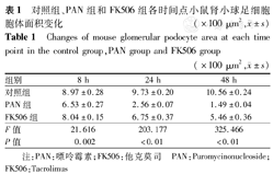 1.足细胞形态:在各个时间点(8 h、24 h、48 h),PAN组细胞体积较对照组缩小,形态改变;FK506组较PAN组体积偏大并饱满,趋于正常。2.IL-27的水平:在各个时间点(8 h、24 h、48 h),PAN组[(110.00±3.52) ng/L、(302.00±6.23) ng/L、(397.00±8.92) ng/L]均高于对照组[(90.00±5.12) ng/L、(85.00±4.21) ng/L、(88.00±4.20) ng/L],差异均有统计学意义(均P<0.05);FK506组[(96.00±4.17) ng/L、(107.00±4.86) ng/L、(112.00±6.24) ng/L]均低于PAN组,差异均有统计学意义(均P<0.05)。3.IL-27 mRNA表达量:在各个时间点(8 h、24 h、48 h),PAN组(1.25±0.11、1.57±0.08、1.73±0.13)均高于对照组(1.02±0.02、1.10±0.04、0.96±0.02),差异均有统计学意义(均P<0.05);FK506组8 h时(1.10±0.06)无明显升高,24 h和48 h时(1.21±0.04、1.30±0.09)表达量稍有升高;与PAN组比较,FK506组均低于PAN组,差异均有统计学意义(均P<0.05)。4.IL-27蛋白的表达量:在各个时间点(8 h、24 h、48 h),PAN组(0.94±0.04、1.56±0.07、1.63±0.04)均高于对照组(0.83±0.04、0.85±0.03、0.83±0.05),差异均有统计学意义(均P<0.05);FK506组(0.84±0.05、0.89±0.04、0.91±0.06)与PAN组比较,8 h无明显差异,24 h后IL-27蛋白表达下降,差异有统计学意义(P<0.05),48 h后IL-27蛋白表达下降更为明显,差异有统计学意义(P<0.05)。
