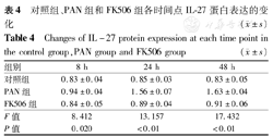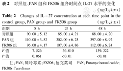 ELISA结果显示,对照组IL-27的水平在8 h、24 h、48 h无明显改变,差异无统计学意义(P>0.05);PAN组IL-27水平在8 h开始升高,24 h、48 h升高更为明显,差异有统计学意义(P<0.05); PAN组IL-27水平在8 h、24 h、48 h均高于对照组,差异均有统计学意义(P<0.05)。FK506组IL-27水平与对照组比较8 h无明显变化,24 h、48 h稍有升高,FK506组IL-27水平在8 h、24 h、48 h均低于PAN组,差异有统计学意义(P<0.05);FK506组与对照组比较,IL-27水平8 h无明显差异(P>0.05),而24 h、48 h高于对照组,差异有统计学意义(P<0.05)(表2)。