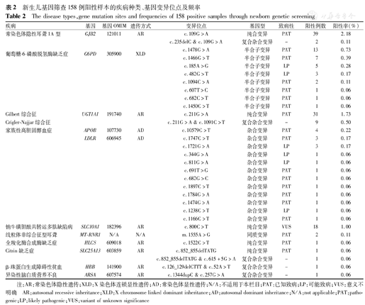 新生儿基因筛查158例阳性样本的疾病种类、基因变异位点及频率