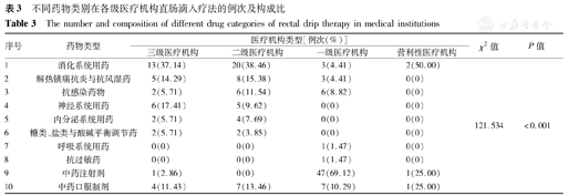 不同类别药物在各级医疗机构直肠滴入疗法的使用情况,见表3。Fisher′s精确检验结果显示,用于直肠滴入疗法的不同类别药物在各级医疗机构间差异有统计学意义(P<0.001)。进一步两两比较显示,一级医疗机构不同类别药物直肠滴入疗法的使用情况与三级医疗机构差异有统计学意义(χ2=64.490,P<0.001),与二级医疗机构差异亦有统计学意义(χ2=85.072,P<0.001)。