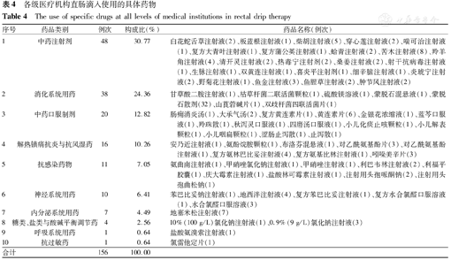 各级医疗机构直肠滴入疗法使用的药物构成比排名前3位的为中药注射剂、消化系统用药、中药口服制剂,具体药物及使用例次,见表4。