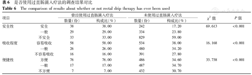 | 项目 | 曾经使用过直肠滴入疗法 | 未使用过直肠滴入疗法 | χ2值 | P值 | |||