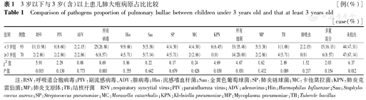 Comparison of pathogens proportion of pulmonary bullae between children under 3 years old and that at least 3 years old[case(%)]