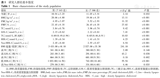 14 309名纳入分析儿童的年龄为(11.0±3.3)岁,男童占49.9%(7 143名),各血脂异常率为3.4%~14.5%,男女童在肥胖状态、血脂水平等方面的差异均有统计学意义(均P<0.05)(表1)。
