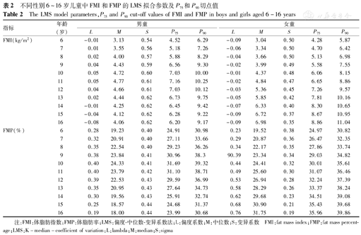 注:FMI:体脂肪指数;FMP:体脂肪率;LMS:偏度-中位数-变异系数法;L:偏度系数;M:中位数;S:变异系数 FMI:fat mass index;FMP:fat mass percentage;LMS:K-median-coefficient of variation;L:lambda;M:median;S:sigma