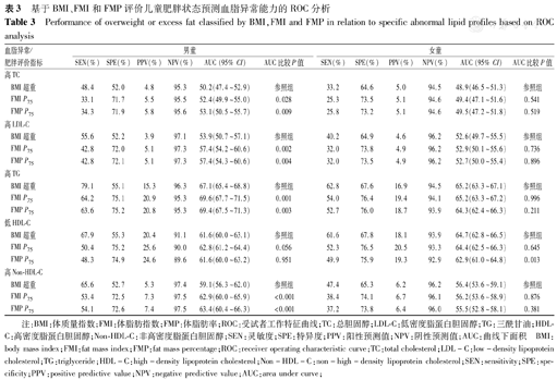 Performance of overweight or excess fat classified by BMI,FMI and FMP in relation to specific abnormal lipid profiles based on ROC analysis