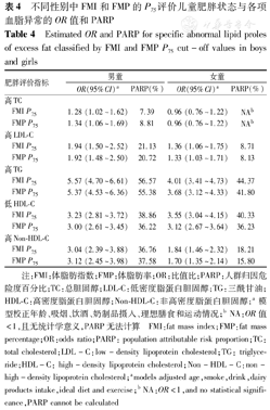不同性别中FMI和FMP的P75评价儿童肥胖状态与各项血脂异常的OR值和PARP