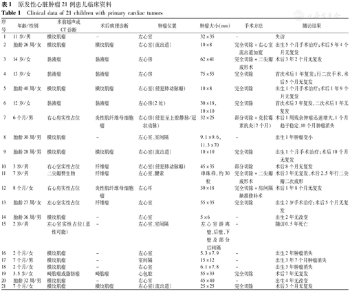 | 21 | 7个月/女 | 横纹肌瘤 | 横纹肌瘤 | 右心室(流出道) | 25×25 | 完全切除 | 术后3个月无复发 |