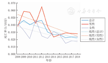 2008年至2018年中国不同年龄、性别分组的哮喘死亡率(1/10万)