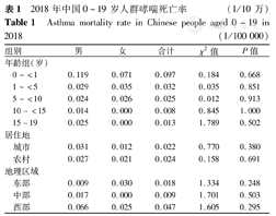2018年,我国0~19岁人群哮喘死亡率为0.023/10万。不同年龄、居住地、地理区域的男性及女性死亡率见表1 。按年龄、居住地、地理区域分组的中国0~19岁人群哮喘死亡率在不同性别间比较,差异均无统计学意义(均P>0.05)。