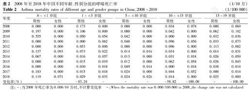 以年为单位的哮喘死亡率计算公式:哮喘死亡率=哮喘死亡数/人口数×100 000/10万(公式1)。计算不同性别、地区分年龄组哮喘死亡率时,哮喘死亡数为某性别、某地区分年龄组哮喘死亡数,人口数为相应的某性别、某地区分年龄组人口数。哮喘死亡率的变化率计算公式:哮喘死亡变化率=(2018年哮喘死亡率-2008年哮喘死亡率)/2008年哮喘死亡率×100% (公式2)。