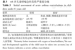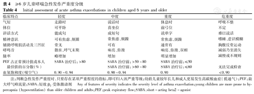 注:a血氧饱和度是指在吸氧和支气管舒张剂治疗前的测得值;b需要考虑儿童的正常语言发育过程;c判断重度发作时,只要存在1项就可归入该等级 aOximetry before treatment with oxygen or bronchodilator;bthe normal developmental capability of the child must be taken into account;cany of these features indicates a severe asthma exacerbation
