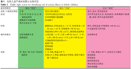 儿童发热不单纯以体温高低和发热持续时间的长短来判断病情严重程度,可采用交通信号灯系统(表1),只要存在"红区"的任何1个症状或体征,即被定为"高危",存在"黄区"任一症状或体征,而无"红区"任一表现,则为"中危",存在"绿区"的症状或体征,而无"黄区"及"红区"任一表现者,则为"低危"。