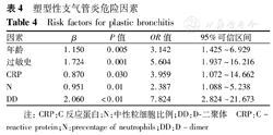 综上所述,年龄>64个月、CRP>35 mg/L、N>0.70、DD>2 000 μg/L、过敏史是MP感染致PB的危险因素,提示发生PB患儿往往存在更强的炎症反应、免疫紊乱及更明显的高凝状态,其中存在过敏史的儿童需多加重视。建议在抗感染、抗炎症反应、改善高凝状态治疗同时积极行纤维支气管镜灌洗术辅助治疗,清除呼吸道分泌物,通畅呼吸道,减少并发症、后遗症的发生,改善患儿预后。本研究仍有不足之处,缺乏对塑型的病理分析,且为单中心、回顾性研究,数据选择上可能存在偏倚。MP感染引起PB作为一种少见、危重的疾病,有待进一步探讨其发病机制和干预措施,并进行随访。