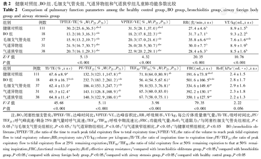 注:BO:闭塞性细支管炎;TPTEF/TE:达峰时间比;VPTEF/VE:达峰容积比;RR:呼吸频率;VT/kg:每公斤体质量潮气量;TI/TE:吸呼时间比;PF/TEF25:呼气峰流速/剩余25%潮气量时呼气流速;TEF50/TIF50:呼吸中期流速比;FRC:功能残气量;Reff:气道阻力;a与闭塞性细支气管炎组相比,P<0.05;b与毛细支气管炎组相比,P<0.05;c与气道异物组相比,P<0.05;d与气道狭窄组相比,P<0.05;e与健康对照组相比,P<0.05 BO:bronchiolitis obliterans;TPTEF/TE:the ratio of the time to reach peak tidal expiratory flow to total expiratory time;VPTEF/VE:the ratio of the volume to reach peak tidal expiratory flow to total expiratory volume;RR:respiratory rate;VT/kg:volume per kilogram;TI/TE:the ratio of inspiration time to expiration time;PF/TEF25:the ratio of peak expiratory flow to tidal expiratory flow at 25% remaining expiration;TEF50/TIF50:the ratio of tidal expiratory flow at 50% remaining expiration to that at 50% remaining inspiration;FRC:functional residual capacity;Reff:effective airway resistance;acompared with bronchiolitis obliterans group,P<0.05;bcompared with bronchiolitis group,P<0.05;ccompared with airway foreign body group,P<0.05;dcompared with airway stenosis group,P<0.05;ecompared with healthy control group,P<0.05