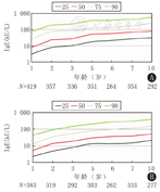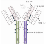 IgE是Ⅰ型变态反应疾病发病机制中最重要的免疫球蛋白,也是过敏性哮喘气道炎症反应的核心。血清IgE含量在不同年龄的健康人群中存在较大差异,随着年龄增长呈上升趋势,10~15岁达到高峰,此后逐渐下降。此外,IgE水平还受环境、种族、检测方法等因素的影响[10]。有研究显示,8~14岁无过敏因素的正常儿童,总IgE的均值为45 kU/L(即45 IU/mL)[11]。1~10岁总IgE水平的变化规律见图1[12]。IgE是由2条相同的轻链和2条相同的重链组成的免疫球蛋白,每一条链均含有1个可变区(VH或VL)和1个或多个恒定区(CH或CL),见图2[13]。轻链和重链的可变区共同组成了IgE分子的抗原结合位点。重链的恒定区(Fc片段)包含IgE与效应细胞表面IgE受体(FcεR)的结合位点(cε3区域的N-糖基化位点)。IgE受体包括高亲和力受体(FcεRⅠ)和低亲和力受体(FcεRⅡ)两种类型,前者主要表达于肥大细胞、嗜碱粒细胞和树突状细胞,后者表达于B淋巴细胞、单核巨噬细胞和EOS等[13]。IgE在血液中的半衰期为2~5 d,但通过与FcεRⅠ的结合后及肥大细胞的调控作用,在血液中可持续存在几周甚至几个月。