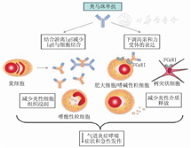 奥马珠单抗可下调效应细胞表面FcεRⅠ的数量和功能,当患者接受奥马珠单抗治疗后,体内游离IgE被奥马珠单抗捕获,导致效应细胞表面的FcεRⅠ无法与其结合,表面FcεRⅠ被加速内吞,从而使细胞脱敏,减少炎症介质释放,对速发相和迟发相过敏反应均有抑制作用[21]。