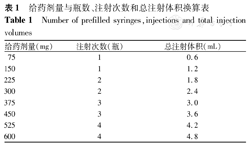 | 给药剂量(mg) | 注射次数(瓶) | 总注射体积(mL) |