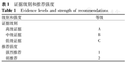2020年9月,由英国伯明翰大学牵头,欧洲多国参与制定的《Alström综合征临床管理指南》在Orphanet Journal of Rare Diseases杂志发布[2]。指南制定工作组包括来自儿童/成人内分泌、心内科、眼科、耳鼻喉科、呼吸科、遗传科、心理科、康复科的专家以及患者支持组织。该指南对截至2019年10月发表的文献证据进行严格审查后,采用定量系统评价证据分级(the grading of recommendations assessment,development and evaluation,GRADE)推荐意见进行证据等级分类,从高到低分为A~C;采用"德尔菲法"征求专家意见,对文中建议的推荐强度进行分类,1为强烈推荐,2为弱推荐,证据级别和推荐强度见表1。