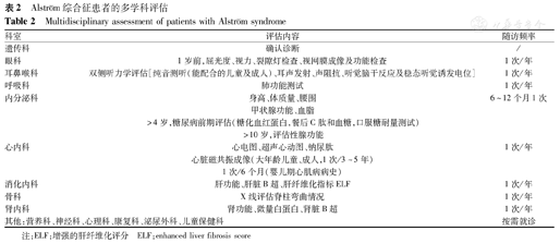 解读:由于ALMS为多系统累及的罕见疾病,凭一个医师或单个科室很难系统管理。指南建议的多学科诊疗管理模式可使患者得到全方位的评估和管理,有很大裨益。主要科室、评估内容及随访频率总结见表2。