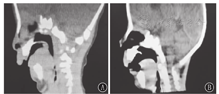 研究期间共收治31例皮罗序列征新生儿。其中男18例,女13例;胎龄34~41周,早产儿2例,足月儿29例;出生体质量1 800~3 700 g。其中并腭裂26例,喂养困难24例,听力异常19例,重度气道梗阻12例(图1),心脏异常12例,放弃治疗出院6例,择期手术出院3例。