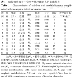 注:M0=无转移性播散;M+=转移性播散;VCR:长春新碱;DMB:促纤维增生/结节型;CMB:经典型;LC/A:大细胞/间变型;NOS:病理类型不明确;aVCR化疗结束至发生肠梗阻时间