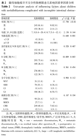 Univariate analysis of influencing factors about children with medulloblastoma complicated with incomplete intestinal obstruction