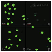 使用原位细胞凋亡检测试剂盒(Roche公司,瑞士)检测内皮细胞凋亡。用含4′,6-二脒基-2-苯基吲哚的抗荧光淬灭剂(中杉金桥生物技术有限公司,北京)对细胞核进行染色。使用共聚焦激光扫描显微镜(Olympus公司,日本),选取450~500 nm激发波长,515~565 nm发射波长进行观察,凋亡细胞的细胞核中观察到绿色荧光。