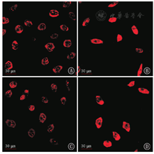处理后的细胞于37 ℃在避光条件下用10 μmol/L超氧阴离子敏感染料二氢乙锭(DHE,碧云天生物科技有限公司,上海)染色30 min。使用共聚焦激光扫描显微镜(Olympus公司,日本),选取535 nm作为激发波长,610 nm作为发射波长进行观察。DHE被活细胞摄入后,在超氧化物阴离子作用下脱氢,产生溴化乙锭(ethidium)。溴化乙锭可与RNA或DNA结合产生红色荧光。当细胞内超氧化物阴离子水平较高时,产生的溴化乙锭较多,红色荧光就较强,反之则较弱。