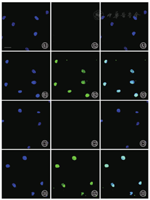 使用NO特异性荧光染料DAF-FM DA(碧云天生物科技有限公司,上海)测定细胞中NO水平。DAF-FM DA可穿过细胞膜,进入细胞质后被细胞内酯酶催化形成不能穿过细胞膜的DAF-FM。DAF-FM本身仅有很弱的荧光,但和NO反应后可产生强烈荧光。使用共聚焦激光扫描显微镜(Olympus,日本),选取495 nm激发波长,515 nm发射波长进行观察,与NO反应后的DAF-FA产生绿色荧光。