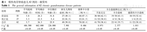 纳入重庆医科大学附属儿童医院明确诊断为CGD且于1999年1月至2016年12月出生的82例患儿,分为存活组和死亡组,对其一般特征、感染、炎症并发症、治疗及生存情况进行分析。