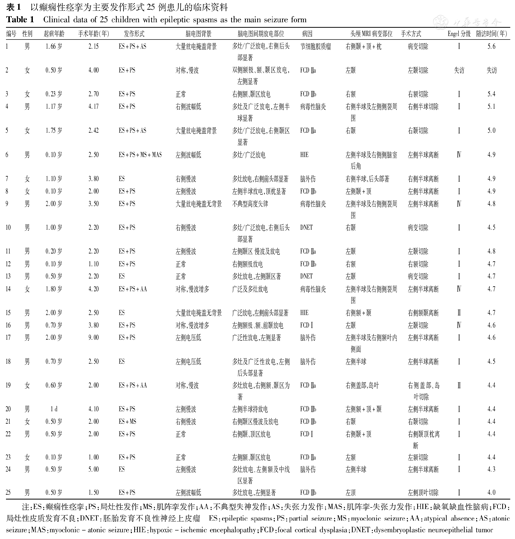 癫痫性痉挛(ES)是婴儿期起病的癫痫发作形式中常见的发作形式,在婴儿期起病的癫痫发作形式中占13.0%~45.5%,病因复杂、治疗困难[1,2,3,4,5,6,7]。既往认为ES为全面性发作,不适合行手术治疗。研究发现ES亦可局灶起始,部分患者行癫痫外科手术治疗可达到无发作状态[8]。因ES的特殊性,如起始难以定位,常伴多种发作形式,脑电多为多灶或广泛性放电,在此类患者中寻找致痫区存在较大的难度和风险。本研究回顾性总结25例以ES为主要发作形式患儿的癫痫发作症状学、药物治疗、头颅磁共振成像(MRI)、脑电图(EEG)、病因学、手术方式及术后恢复情况,以期提高临床医师对本病的认识。