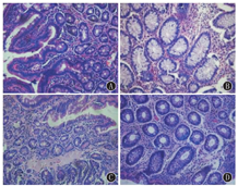 17例EG患儿中,16例(94.12%)为首次就诊,1例(5.88%)为复发患儿;其中腹痛14例(82.35%)、腹泻3例(17.65%)、呕吐3例(17.65%)、便血2例(11.76%);4例(23.53%)有过敏史。EG患儿内窥镜下表现主要为:黏膜充血水肿15例(88.24%)、黏膜粗糙4例(23.53%)、黏膜出血3例(17.65%)、滤泡样增生2例(11.76%)及糜烂1例(5.88%)。本研究所用样本取自该17例患儿受检黏膜中的28份黏膜组织,病理HE染色下可见EG组患儿肠黏膜固有层内EOS增多,EOS计数(42.79±3.50)个/每高倍镜视野(图1A、图1B)。对照组患儿肠黏膜组织镜下结构基本正常,仅散在炎症细胞及EOS浸润(图1C、图1D)。