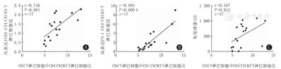 EG组患儿外周血中Tfh细胞比例与ICOS、PD-1表达量均呈正相关(r=0.746、0.893,均P<0.05)(图3A、图3B);与外周血中IgE水平呈正相关(r=0.587,P<0.05)(图3C);与外周血EOS、白细胞计数均无相关性(均P>0.05)。