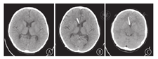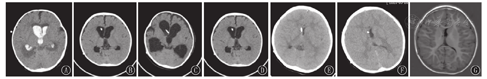 患儿均在急诊就诊期间行头颅CT检查,多数患儿急诊就诊时头痛剧烈难以耐受MRI,故仅个别患儿(例10)急诊完善头颅MRI检查。SVS发生时,头颅CT示脑室形态呈裂隙样、分流管位置贴壁。患儿脑室-腹腔分流术前、术后以及发生SVS时的头颅影像学表现见图1,图2。