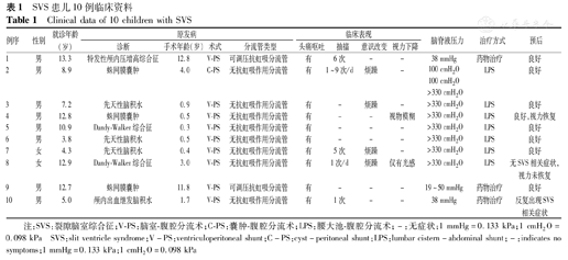 注:SVS:裂隙脑室综合征;V-PS:脑室-腹腔分流术;C-PS:囊肿-腹腔分流术;LPS:腰大池-腹腔分流术;-:无症状;1 mmHg=0.133 kPa;1 cmH2O=0.098 kPa SVS:slit ventricle syndrome;V-PS:ventriculoperitoneal shunt;C-PS:cyst-peritoneal shunt;LPS:lumbar cistern-abdominal shunt;-:indicates no symptoms;1 mmHg=0.133 kPa;1 cmH2O=0.098 kPa
