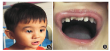 入院时查体:头围45 cm,身高80 cm,体质量9 kg(低于同年龄性别的第3百分位),神志清楚,精神可,反应一般,表情欠灵活,短人中,小下颌,上唇薄,牙齿不齐,出牙不全(图1),言语不能,双侧瞳孔等大等圆,对光反射灵敏,眼球活动自如,眼球震颤(+),颈软,心、肺、腹查体未见异常,行走不稳,步基增宽,指鼻试验(+),四肢肌力、肌张力正常,膝腱反射稍活跃,病理征阴性。